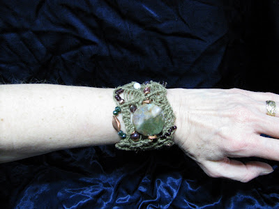 I've been doing several new things lately that I plan on getting on the site eventually, but since I just finished one of my favorite ones a couple days ago I can't stop going back and trying it on. Already I've had many compliments on how "cool" it is. So I thought I would give you a little sneak peak at a new line of macrame' bracelets I will be doing. They will be called "Dream Catcher Cuffs" and each will be truly one of a kind, because as you can see, there is absolutely no way any two could possibly alike! They will be coming soon, as soon as I can dream them up!